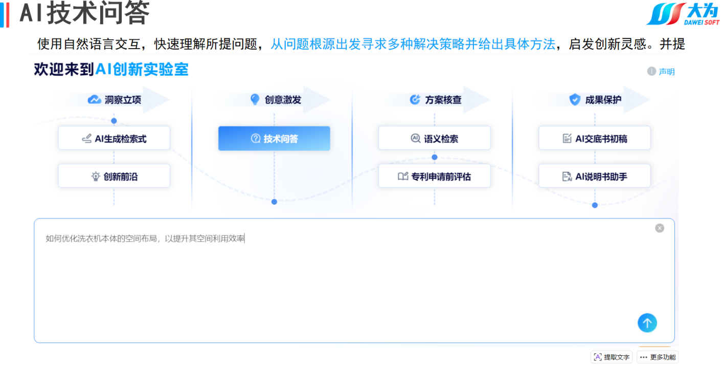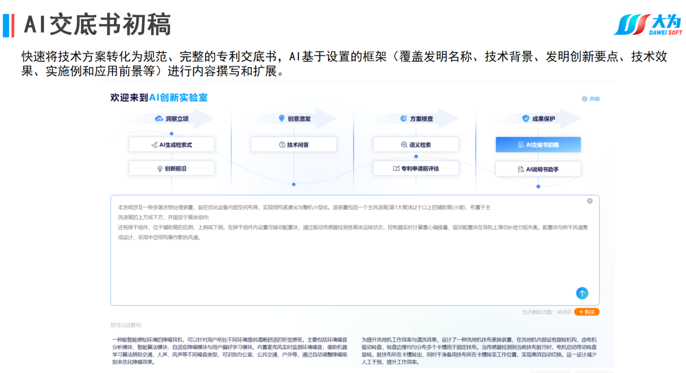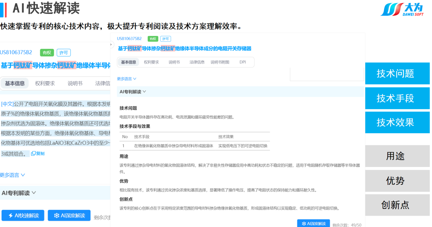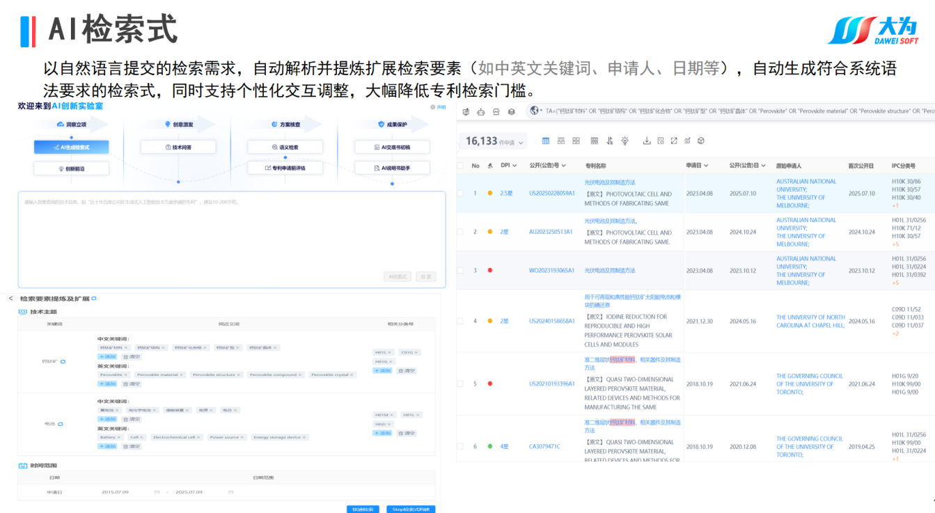 大为全球专利检索分析系统提供方便快捷的全球数据获取通道,高度整合专利文献资源,涵盖全球170个国家和地区超过1.9亿多条专利数据,如专利文摘、说明书、法律状态、同族专利、引证引用等信息,每周更新5次以上。同时还提供AI智能检索、大为独有的DPI检索等十余种检索方式,内置多维度百余种分析模板,提供大为DPI价值指数分析,支持一键导出AI查新报告和专利价值评估报告,支持自主创建工作空间,便捷的实现外部数据导入、交互、标引与扩展等,支持专利云笔记,能随时记录、整理和保管专利相关内容和创新成果;同时支持全国高校专利专题数据库、AI创新实验室、专利申请前评估等功能。