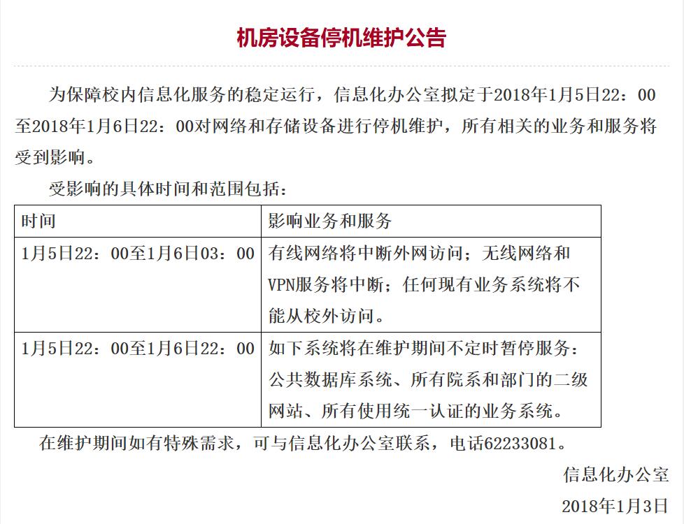 信息化办公室拟定于2018年1月5日22:00至2018年1月6日22:00对网络和存储设备进行停机维护,在此期间不定时会出现个人图书馆无法登陆、图书馆网络中断、VPN无法登陆、无法自助文印、研讨间无法预约等现象,请同学们做好准备。