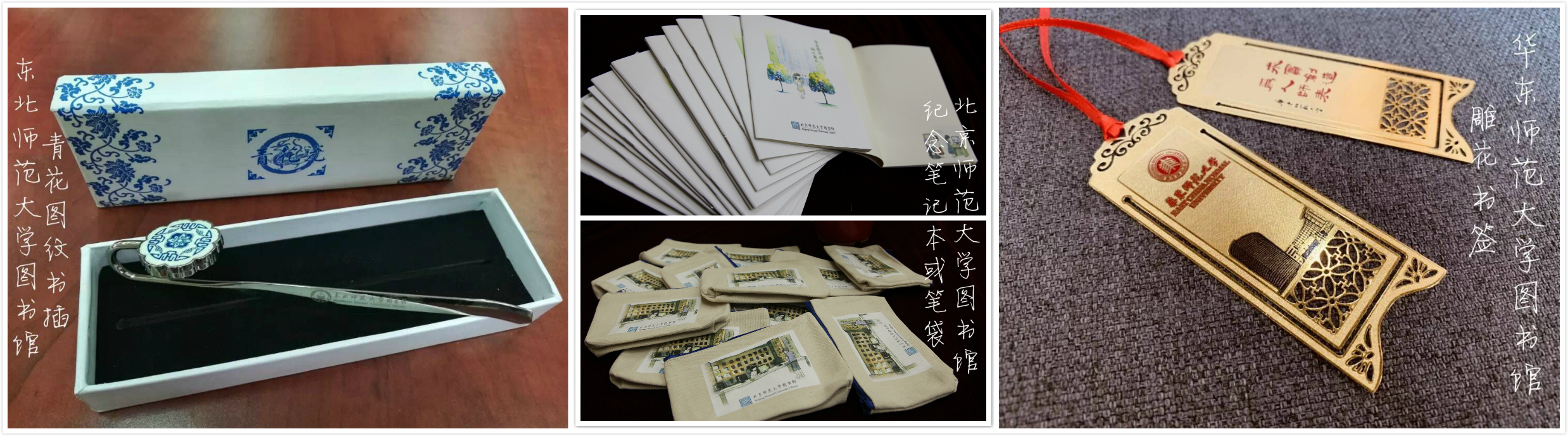 除了文献资源大餐外,三馆还为用户准备了特供美食——定制文创礼品一套:①青花图纹书插+②纪念笔袋或笔记本+③雕花书签,只要参与以下活动,即有机会获赠礼品: