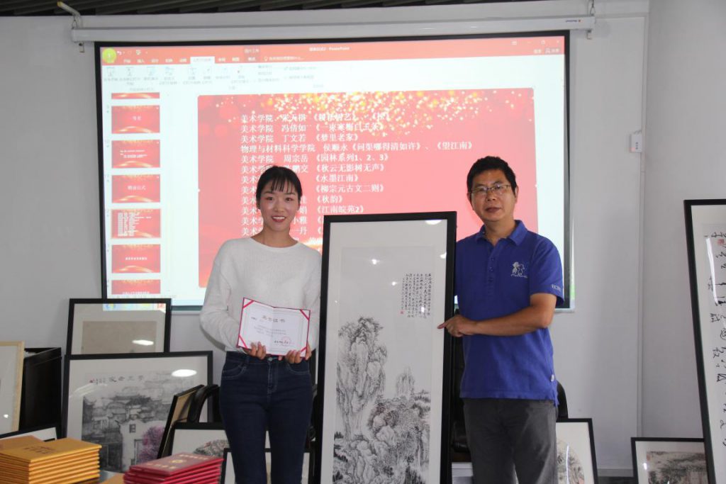 画展共有40余名师生获得奖项,其中一等奖3名,二等奖6名,三等奖8名,入围奖24名。同时,有17名获奖师生将他们的书画作品馈赠给了我校图书馆,他们的作品将永久保留在华东师大。魏明杨副馆长向获奖的师生表示祝贺,并对捐赠者表示感谢,他说,师大人都受到了华师大深厚文化底蕴的学府陶冶和熏染,将自己创作的作品留给母校图书馆,更让生命与母校以根相连。他指出,未来图书馆将更及时地响应光大师生的呼声,与大家群策群力举办更多活动,搭建好文化传承的平台,为推广优秀传统文化尽一份力量。