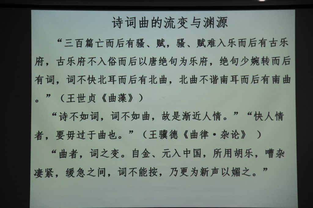 钱老师首先指出,中国自古以来就有诗乐传统,3000年前已经趋于成熟,诗经、楚辞是其杰出代表。这些诗歌从来不是单纯的文学形式,当时可以配以曲调加以演唱。