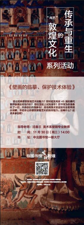 想近距离感受敦煌艺术的魅力?想知道莫高窟45窟的唐代菩萨像是如何创作的? 想在宣纸上试炼身手?图书馆为你准备好了一切,只待你的热情参与! 现场有美术系壁画专业老师演示讲解,手把手让你感受敦煌艺术的独特魅力。还等什么?赶紧来参加吧!