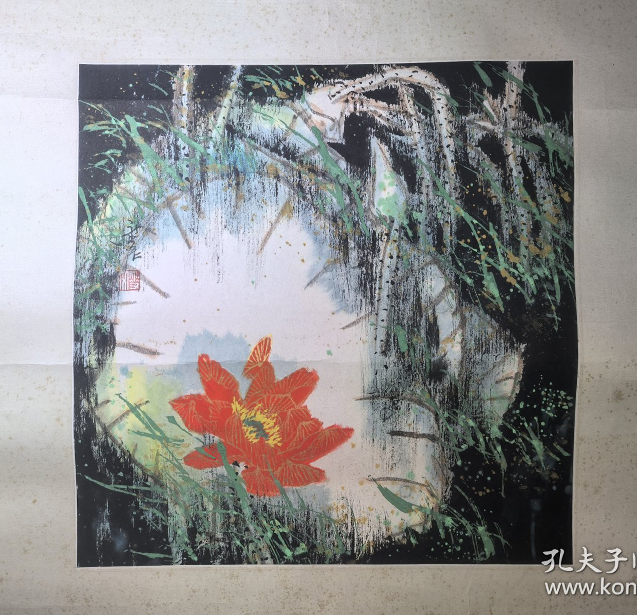 著名画家马燮文绘设色金粉红莲花镜片(施平藏)