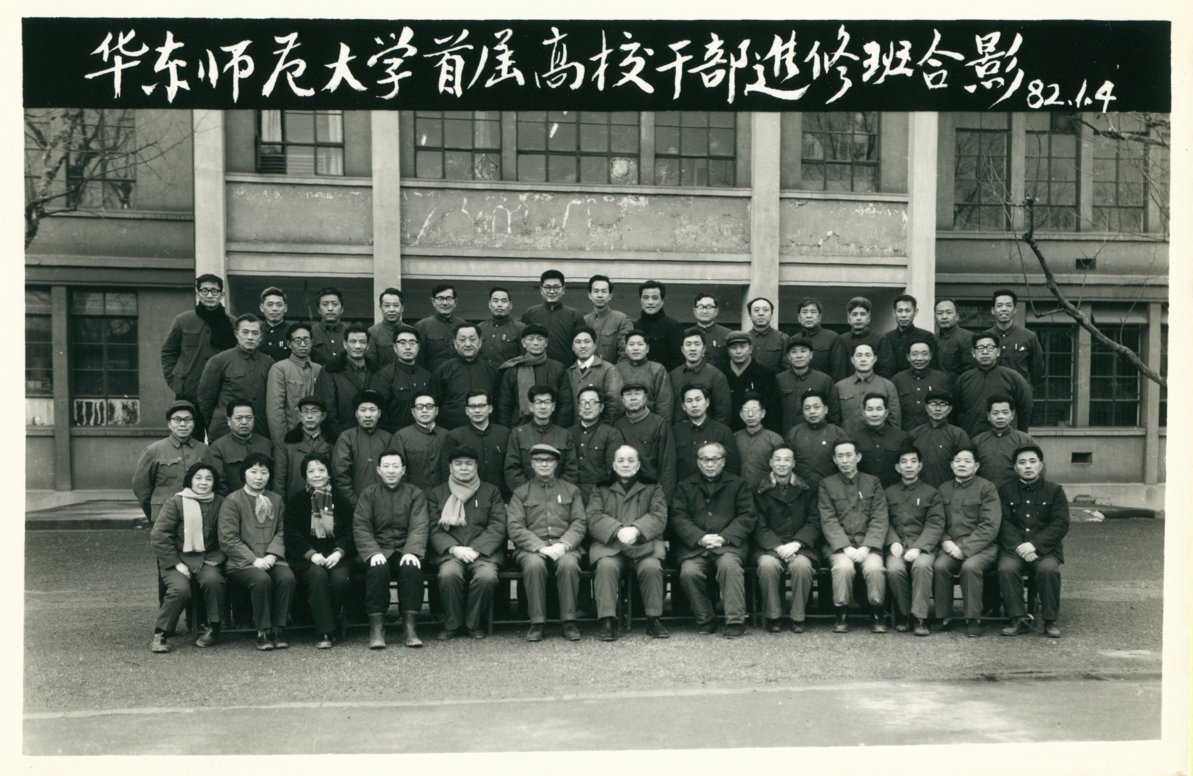 1982年1月4日 华东师大举办首届高校干部进修班 左4 袁运开(时任华东师大副校长)、 左5 余力(时任上海高校教局副局长)、左6 施平(校党委书记) 、左7 舒文(上海市教卫办主任)、左8刘佛年校长、左9瞿葆奎。(来源:刘佛年家属刘安安提供)(点击图片,可查看高清原图!)
