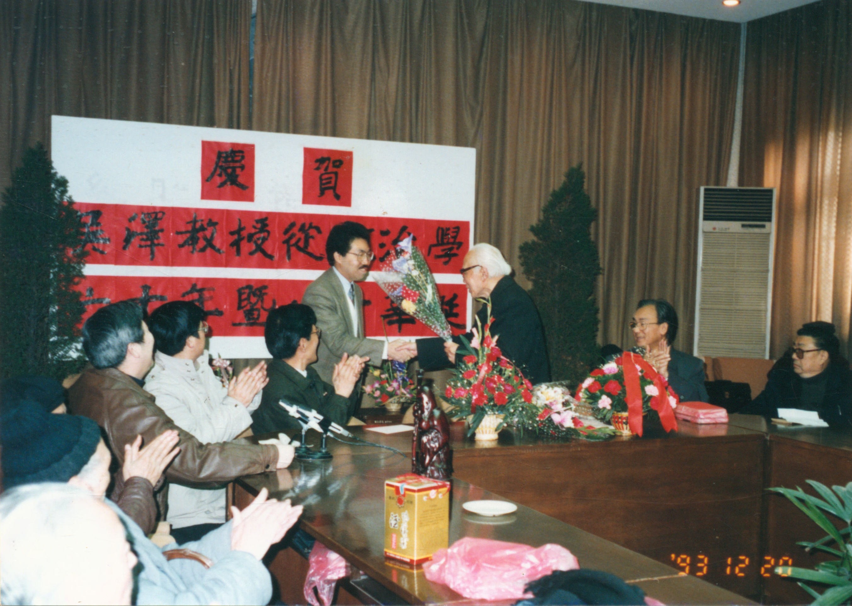 1993年12月20日,吴泽教授从教治学六十年暨八十华诞,井上聪博士献花留影
