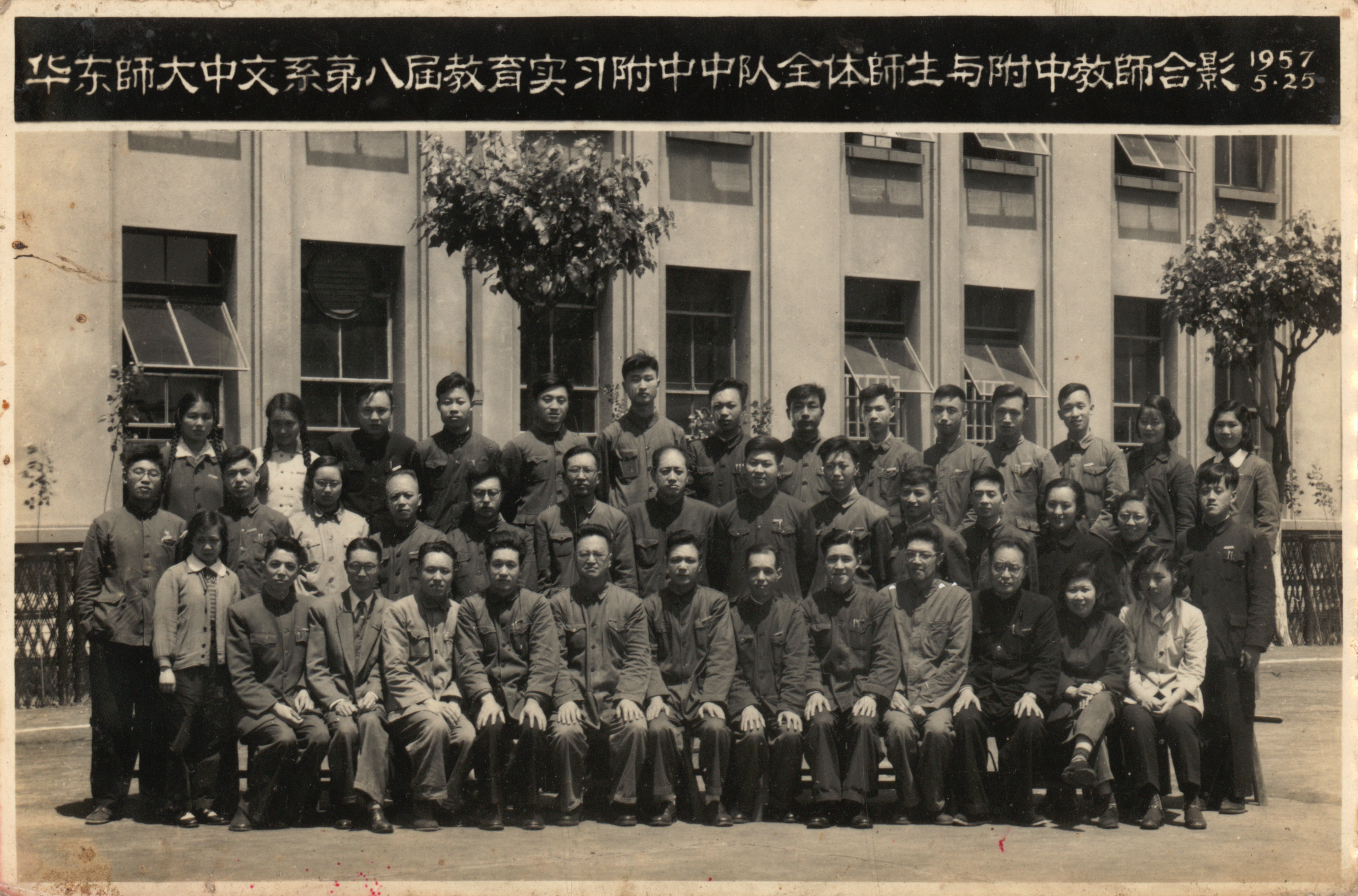 1957年5月25日华东师大中文系第八届教育实习附中中队全体师生与附中教师合影,赵善诒(前排左6)、叶百丰(前排左10)、罗永麟(2排左7)
