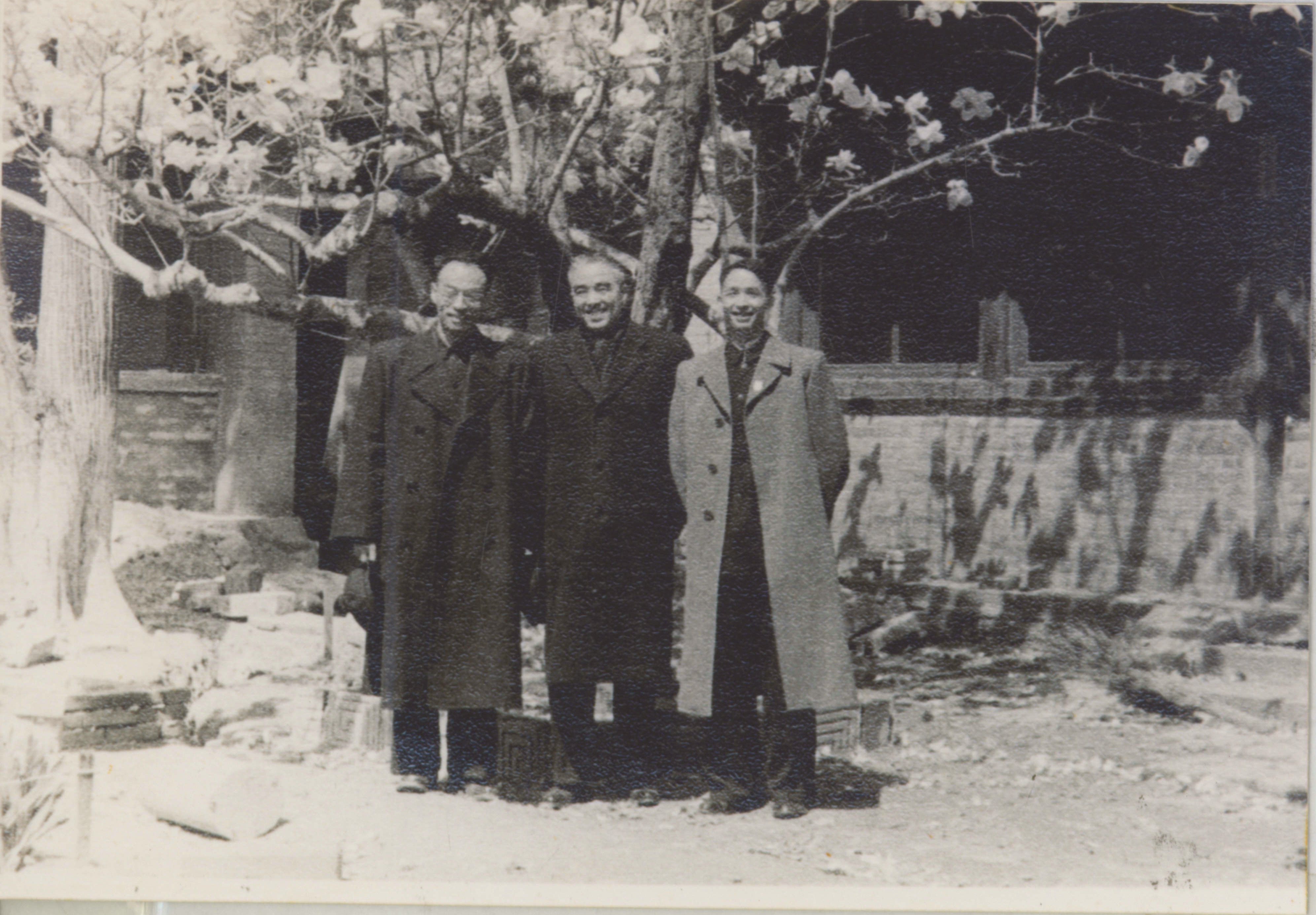 1950年代施平、孙晓村、马适安(副校长)在北京农业大学罗道庄校园内合影(从右至左)