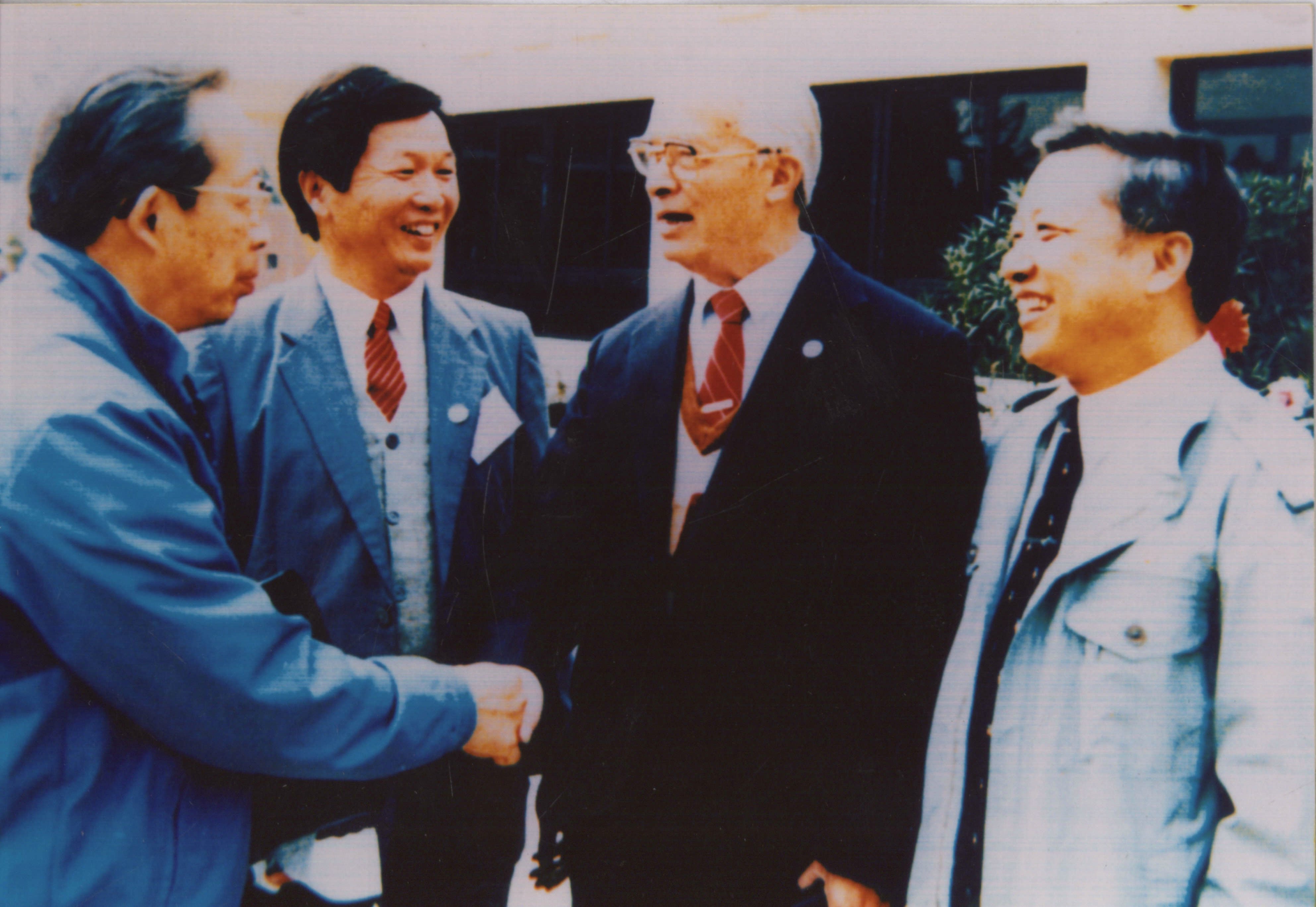 1990年10月9日北京农业大学85周年校庆庆典大会期间,石元春校长(左一)、周鹏程书记(右一)与施平老校长(右二)畅谈