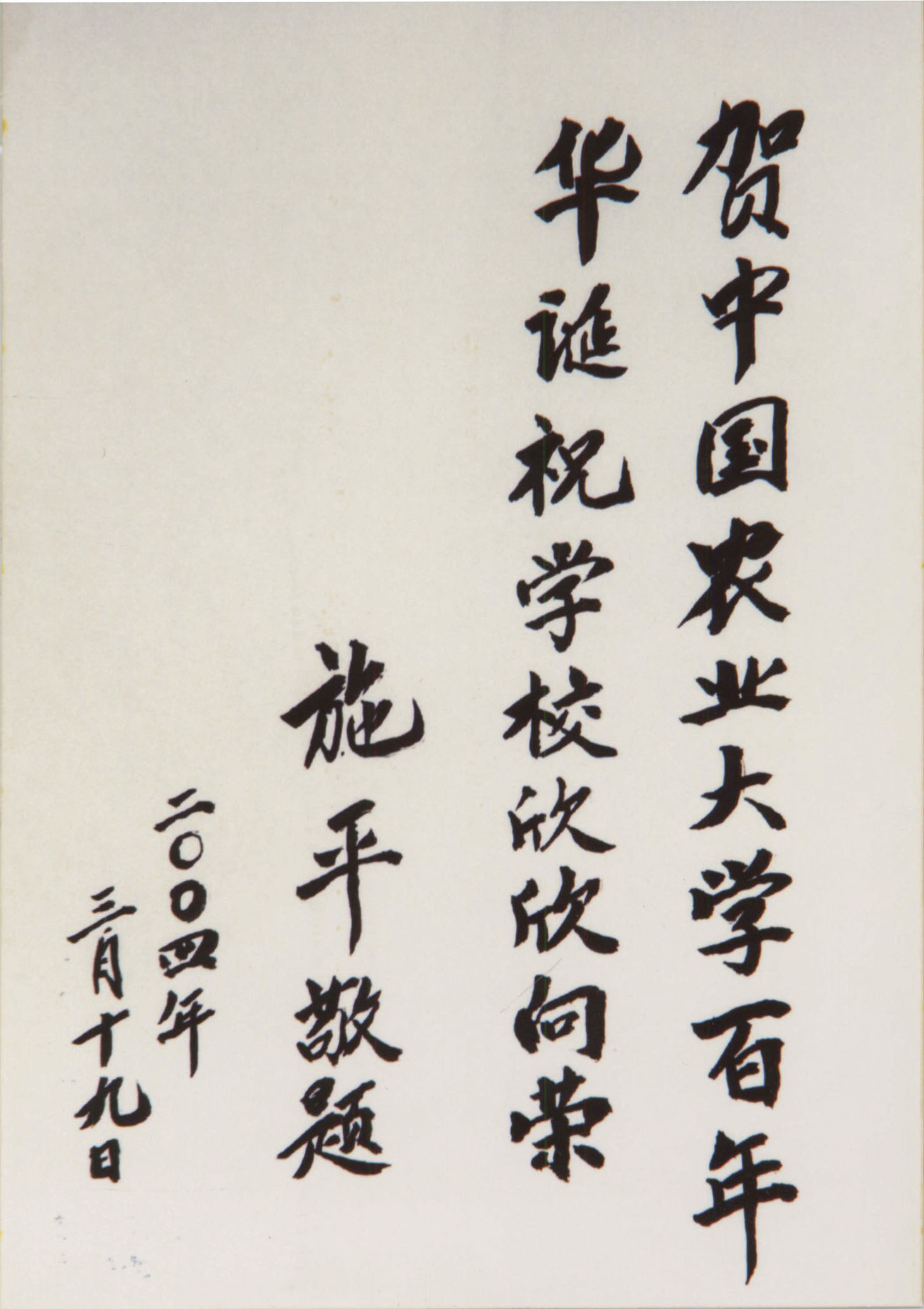 2004年3月19日施平在上海寓所为即将迎来百岁华诞的中国农业大学题词,并捐赠1万元