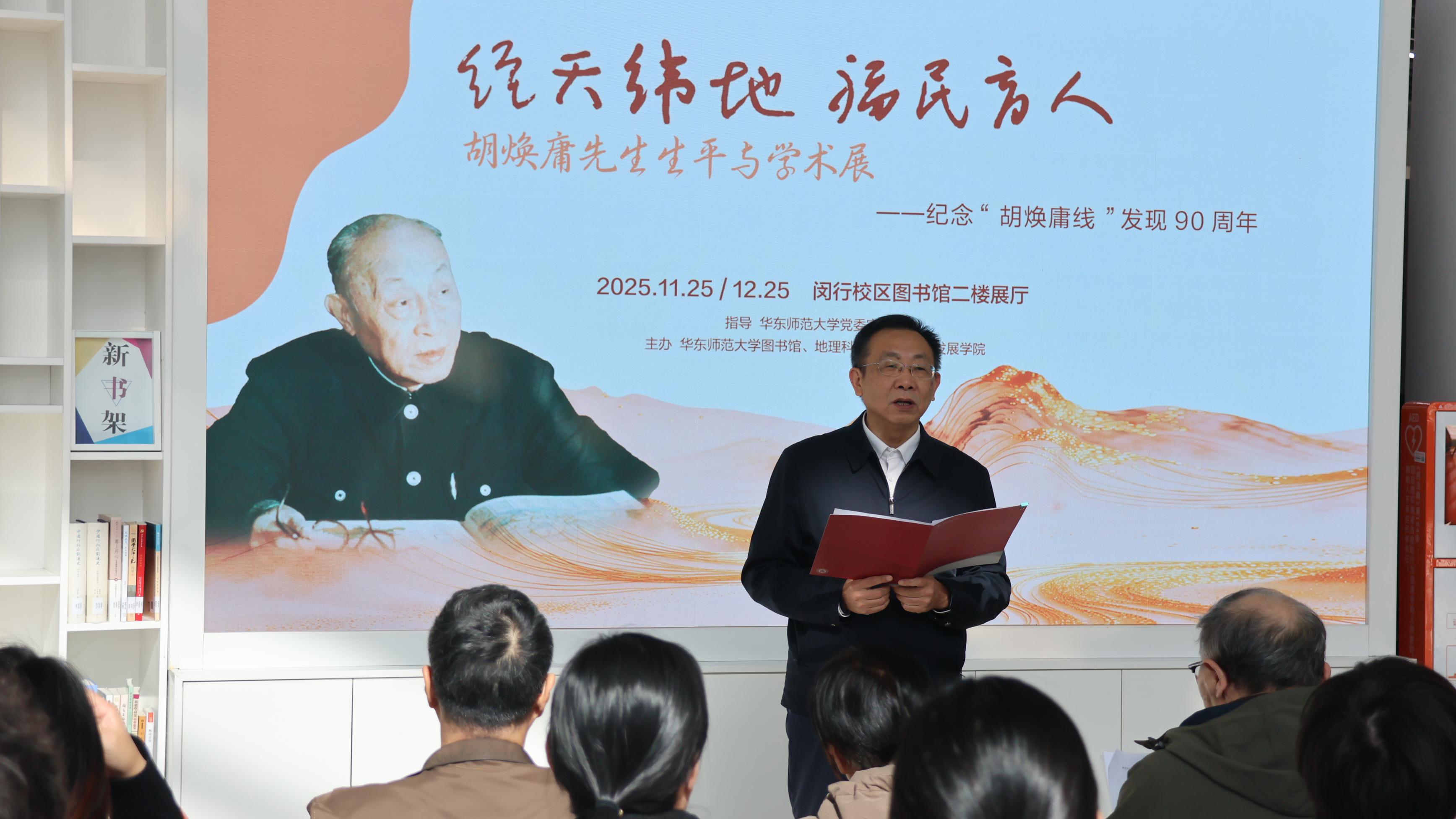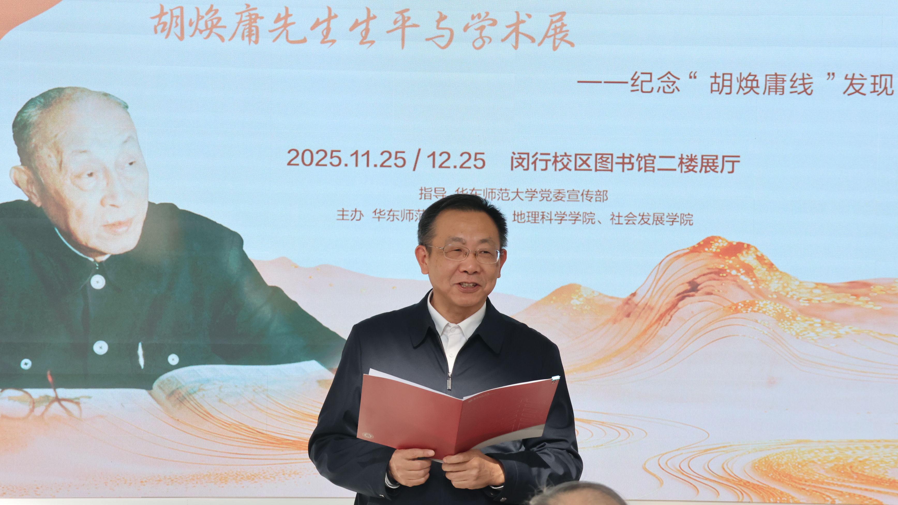 曹友谊在致辞中指出,胡焕庸先生是我国著名的地理学家,是人口地理学的奠基人,更是一位矢志“福民育人”的教育家,其身上所体现的爱国情怀、务实作风和育人初心,正是我们今天要大力弘扬的教育家精神的生动写照。他强调,华东师大正朝着第十四次党代会确立的建设引领育人创新的中国特色世界一流大学目标奋进,本次展览正是我校以高质量党建引领事业高质量发展、推动跨学科协同育人的一次有益实践。