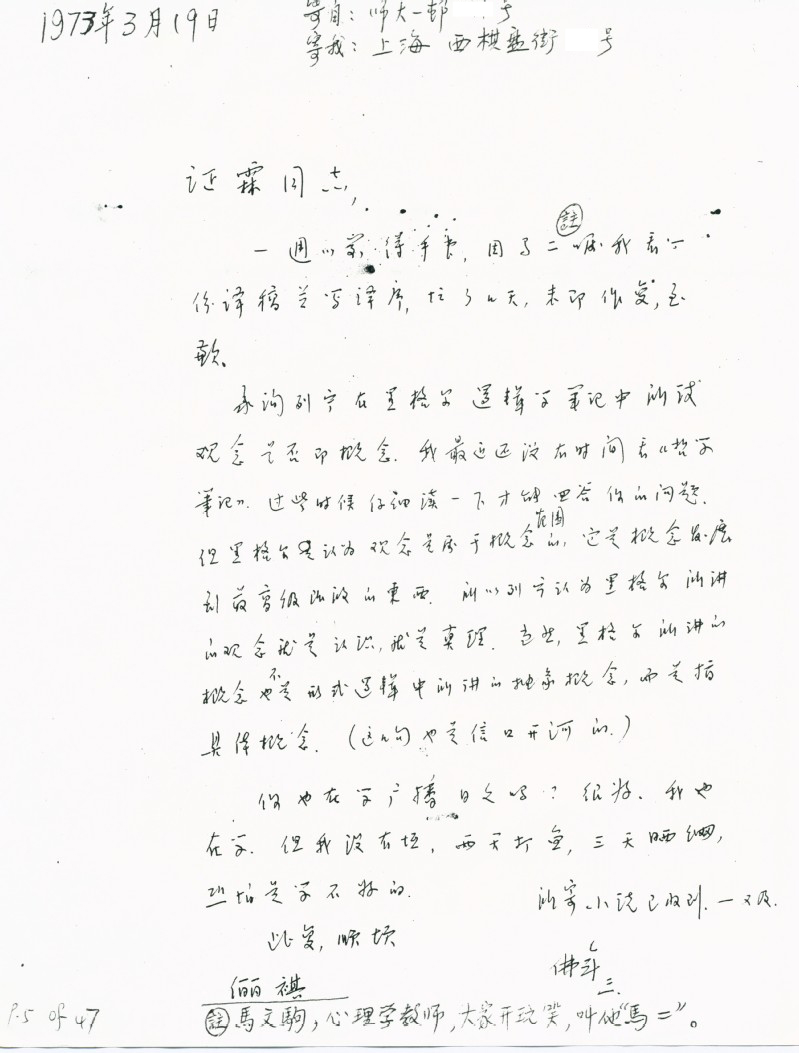 刘佛年致丁证霖信札1973.3.19