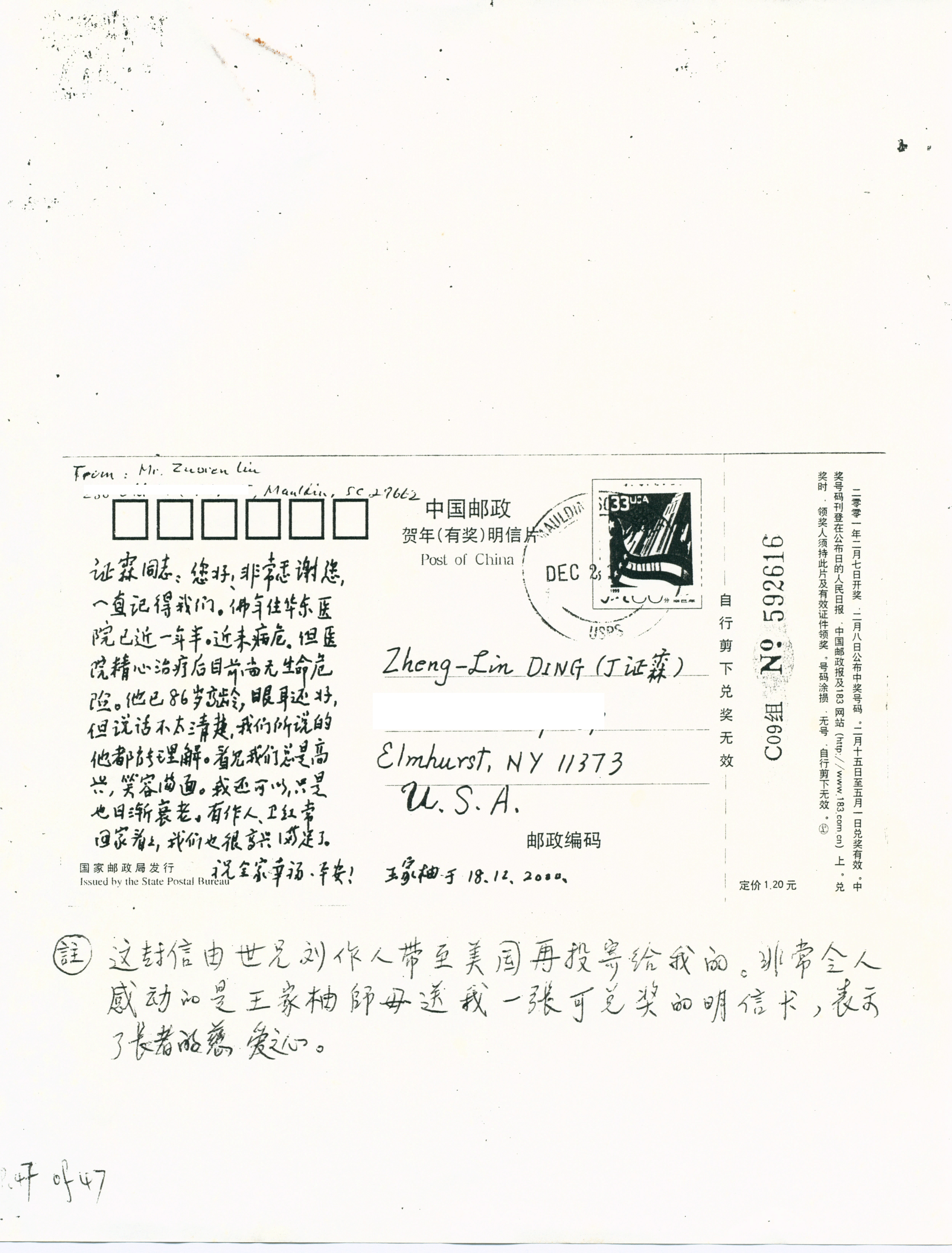 刘佛年夫人王家柚致丁证霖信札2000.12.18