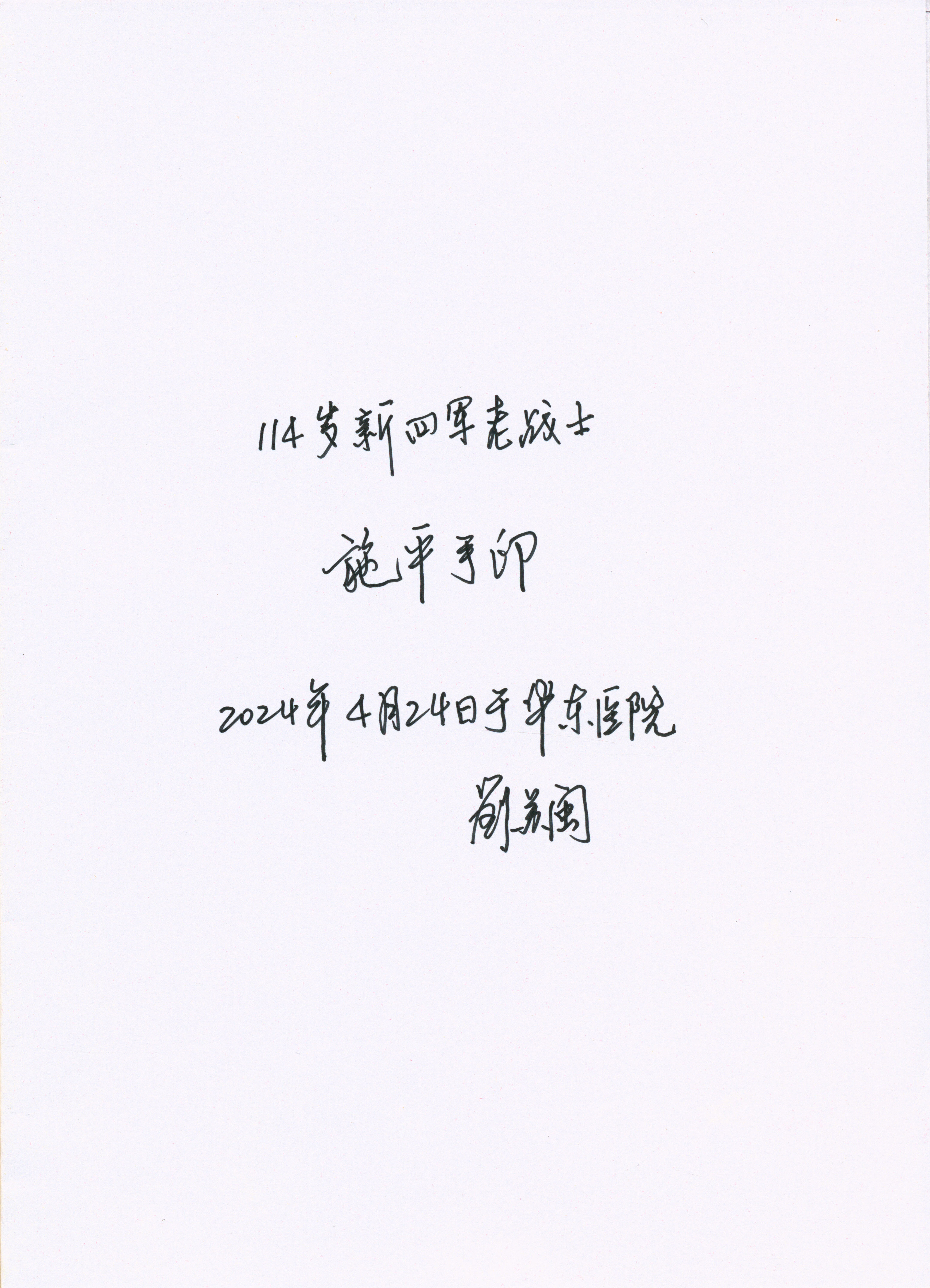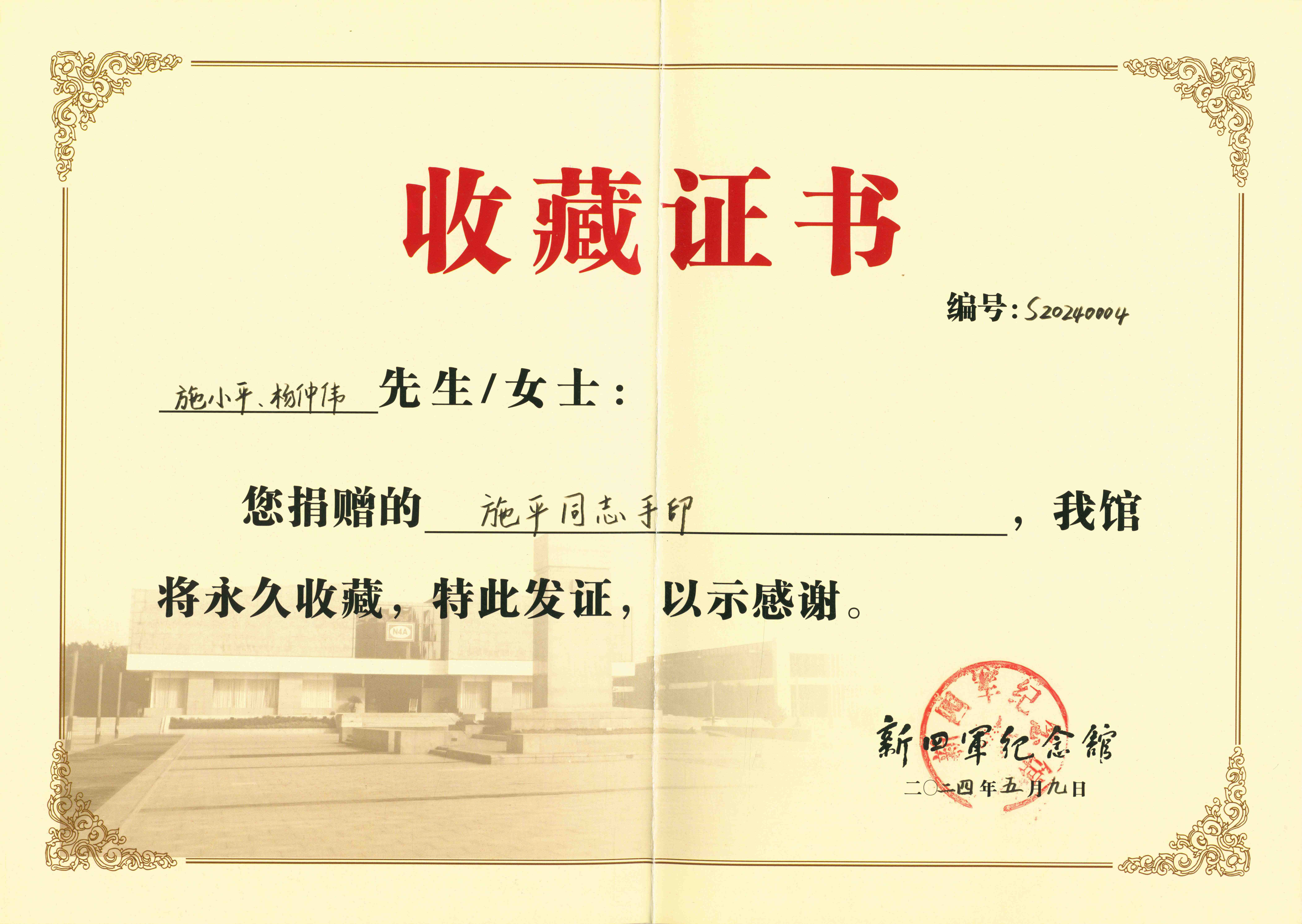 新四军纪念馆收藏证书:施平同志手印