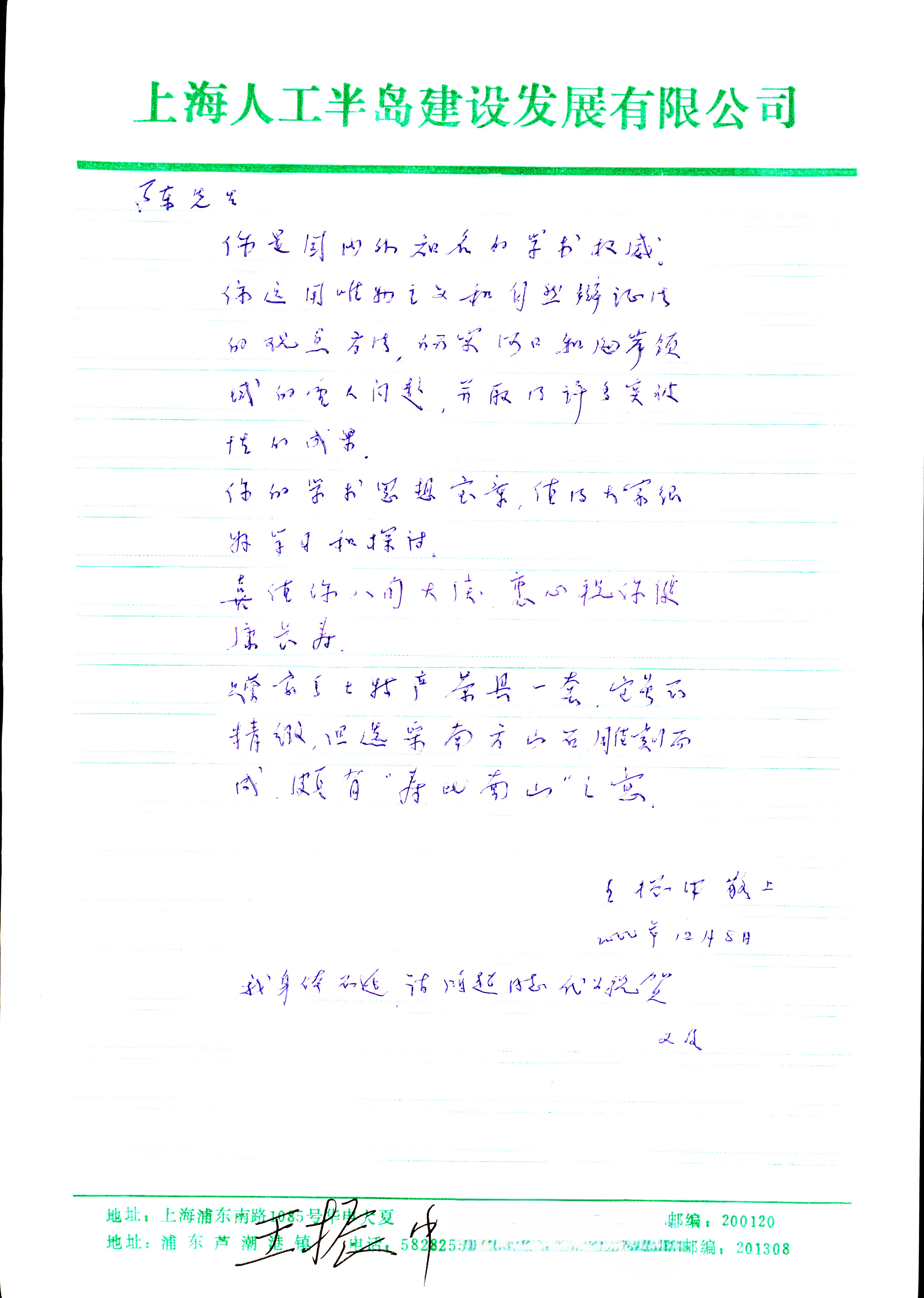 2000年12月5日王振中给陈吉余的手稿信件
