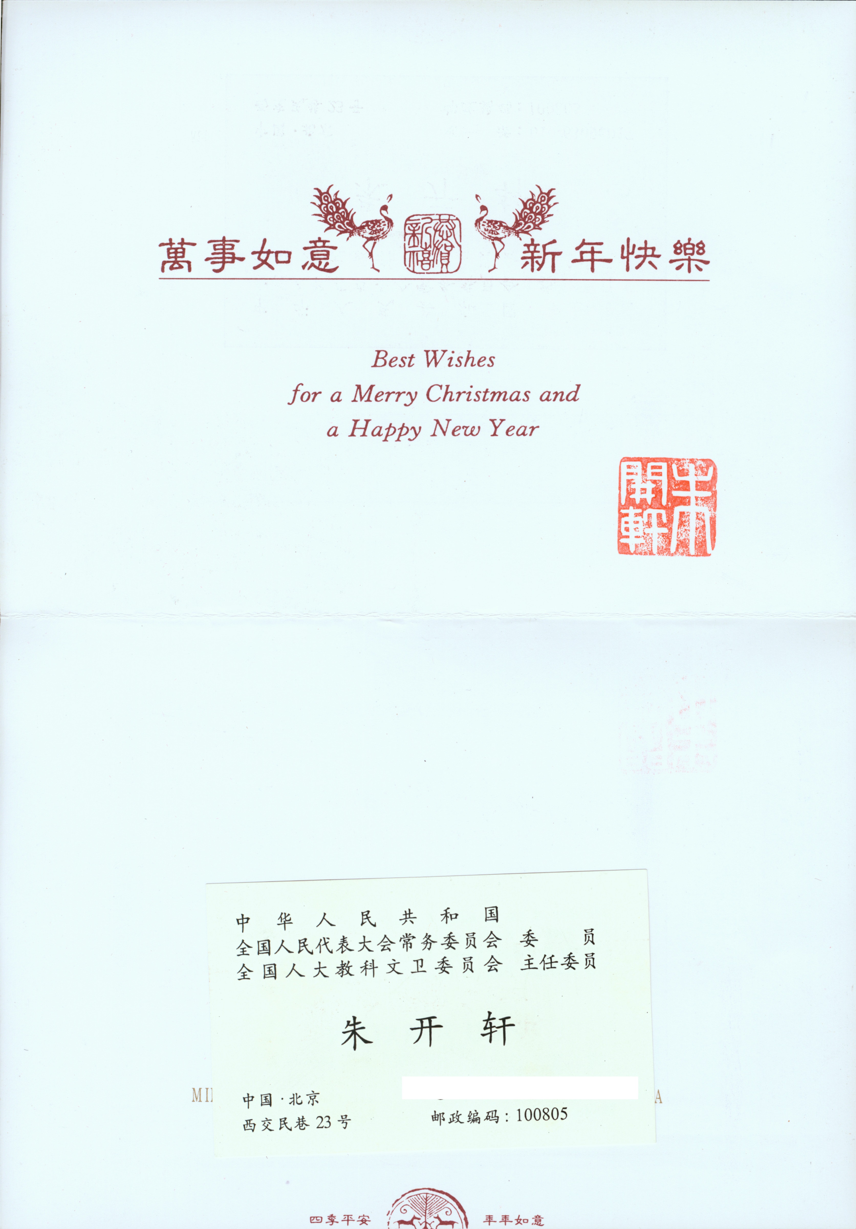 摘要:全国人大常务委员会委员朱开轩给陈吉余院士贺卡