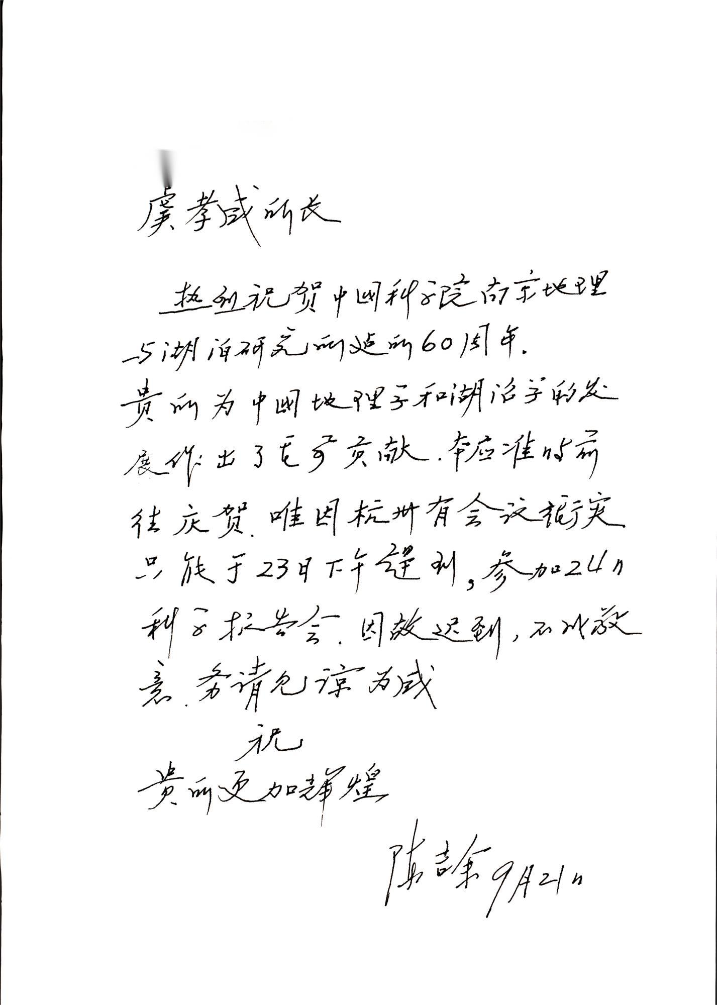 2010年9月21日陈吉余给中科院南京地理与湖泊研究所贺信