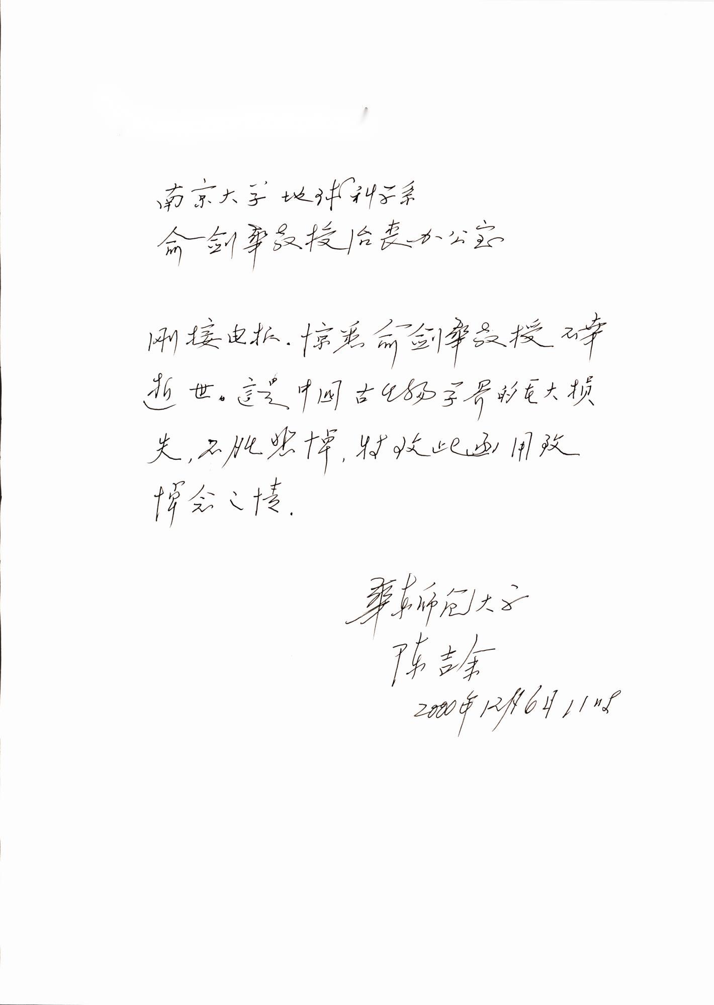 2000年12月6日陈吉余给俞剑华教授治丧办公室唁电