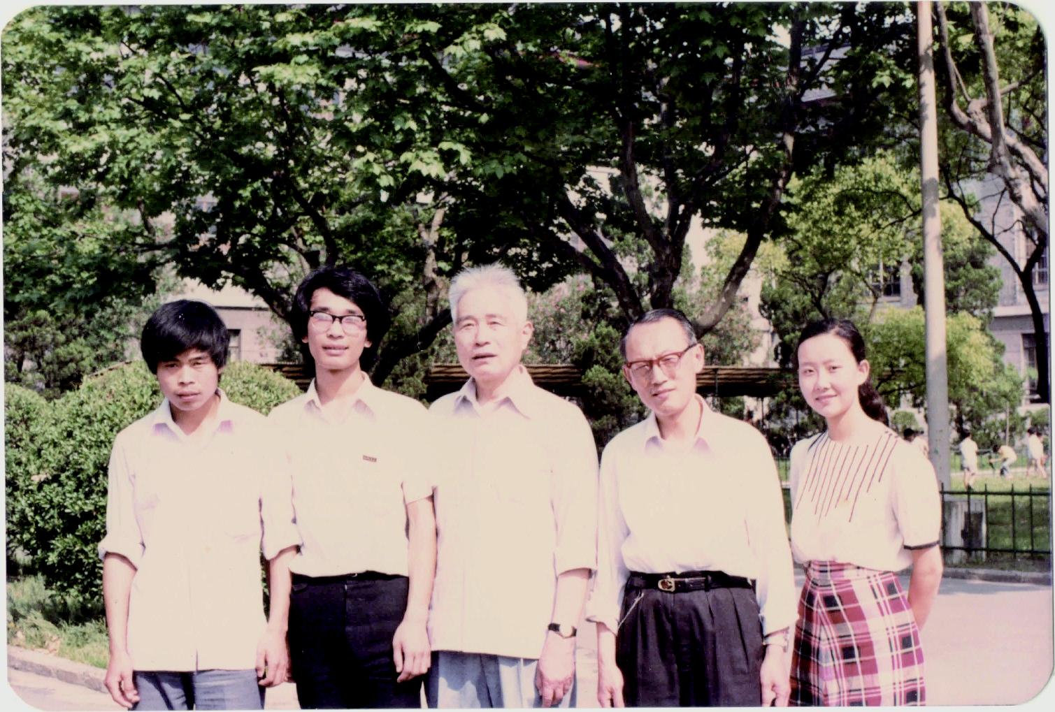 1980年代褚绍唐先生与历史地理研究生(右起:张晓虹、洪建新、褚绍唐、吴必虎、黄建军)
