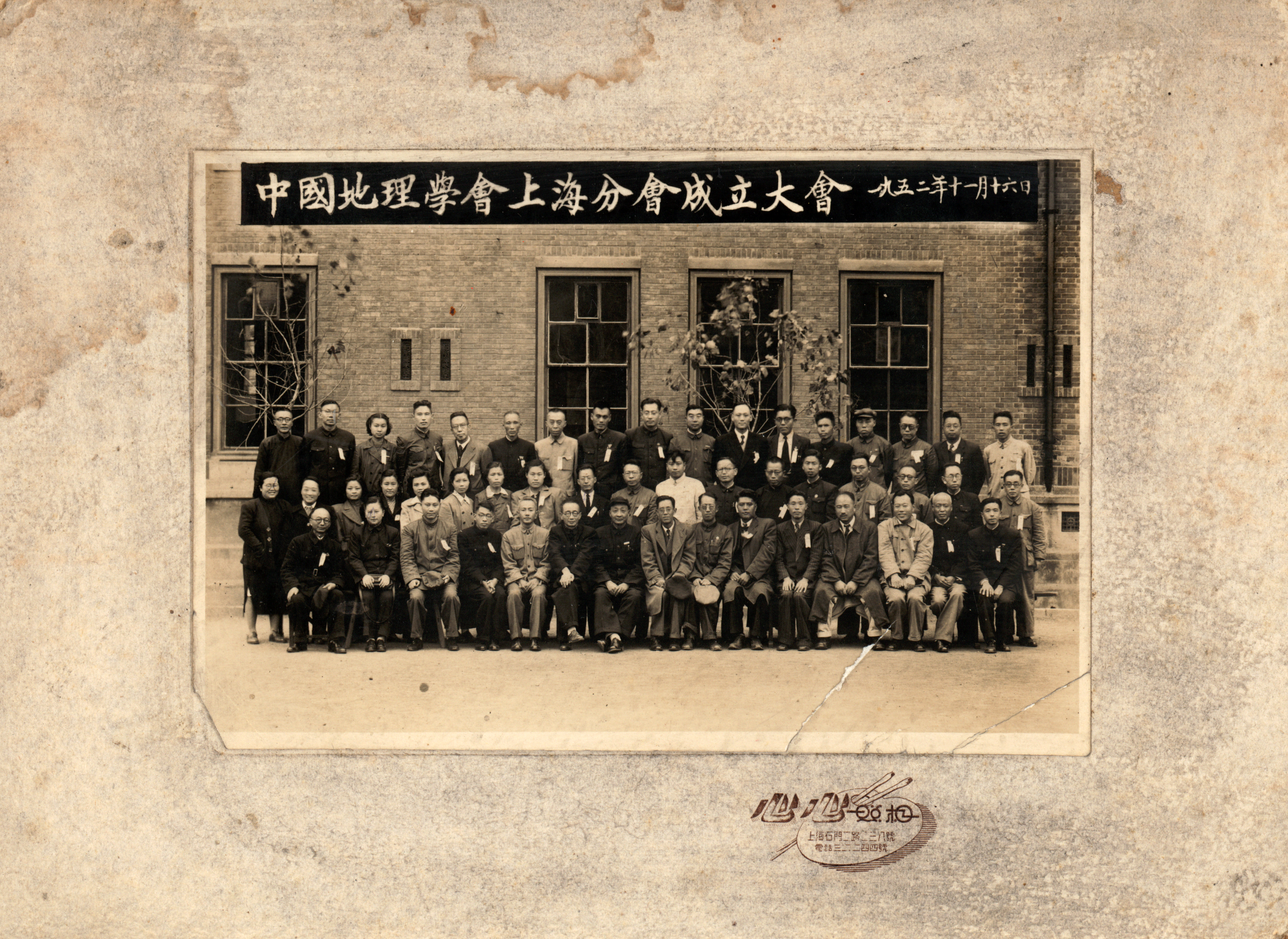中国地理学会上海分会成立大会1952年11月16日,严钦尚(1排右5)、李春芬(1排右6)、周淑贞(2排左1)、钱今昔(2排左9)、陈吉余(2排左11)、褚绍唐(3排左4)、程潞(3排左9)、苗迪青(3排左10)。(来源:胡焕庸之子胡企中提供)。(点击图片,可查看高清原图!)