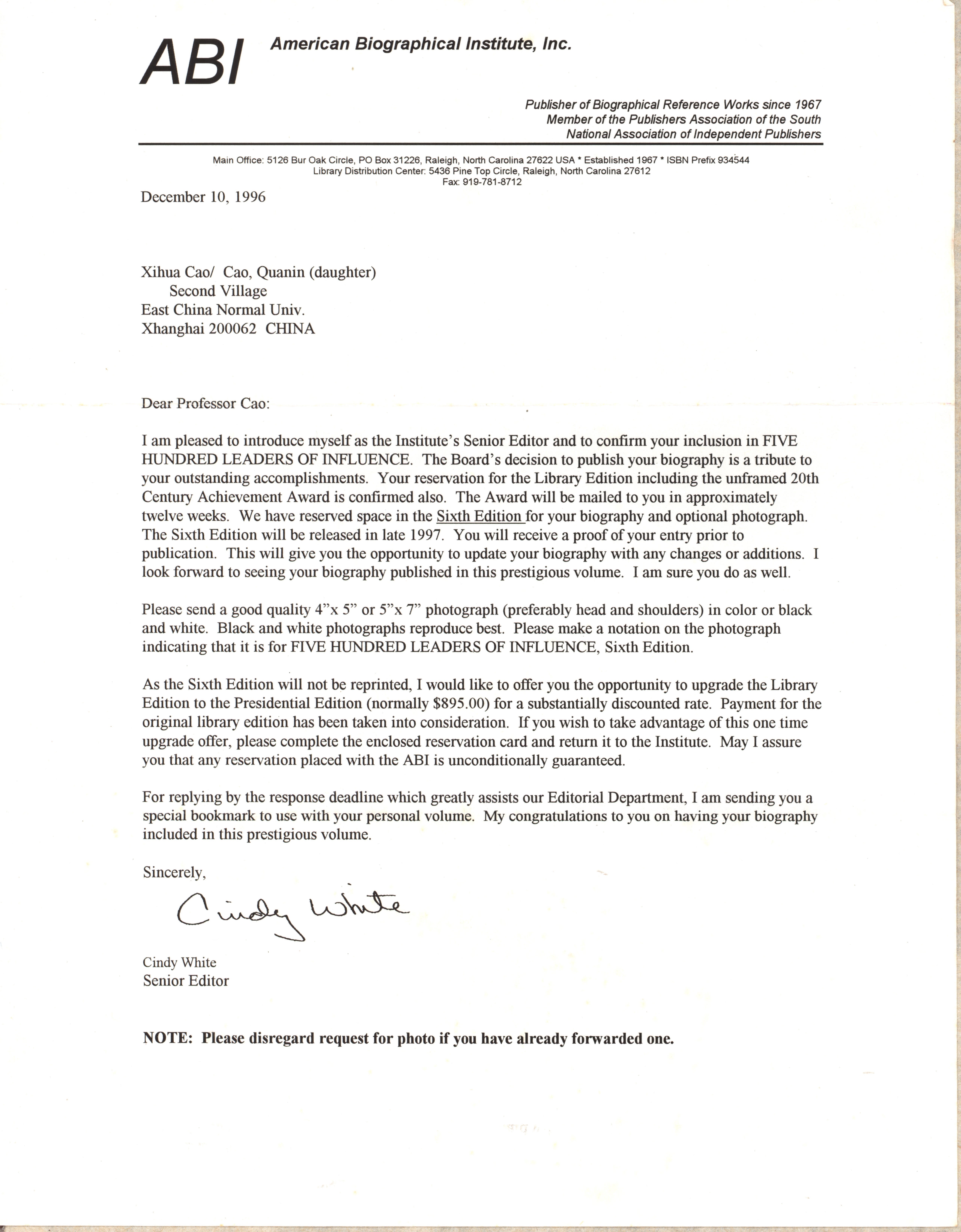 1996年12月29日《Five Hundred Leaders of Influence》入典信