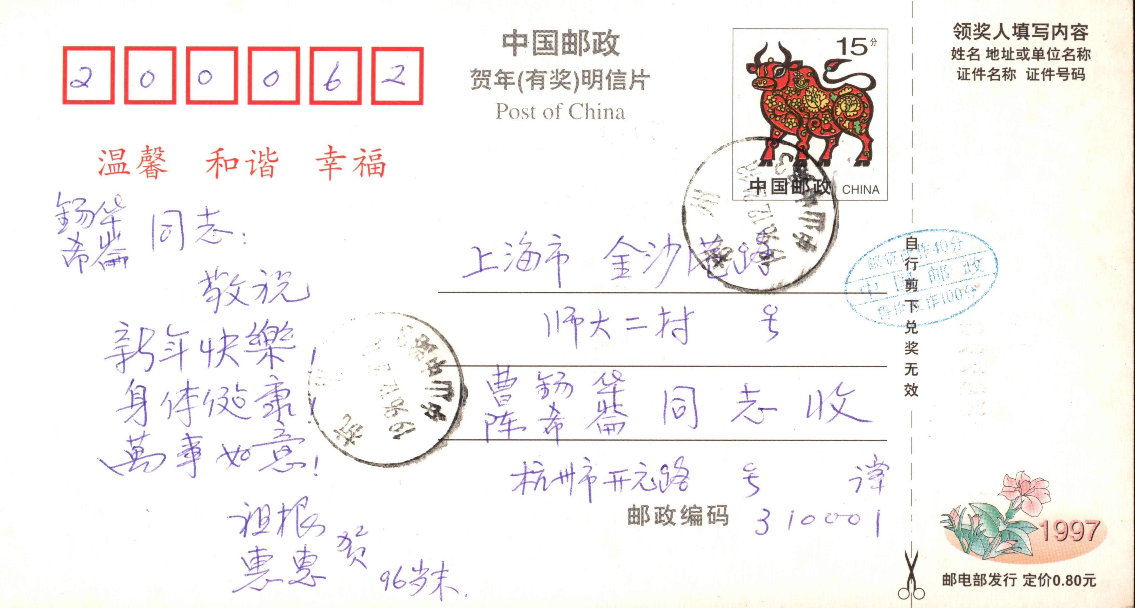 1996年岁末谭祖根、惠惠致曹锡华夫妇