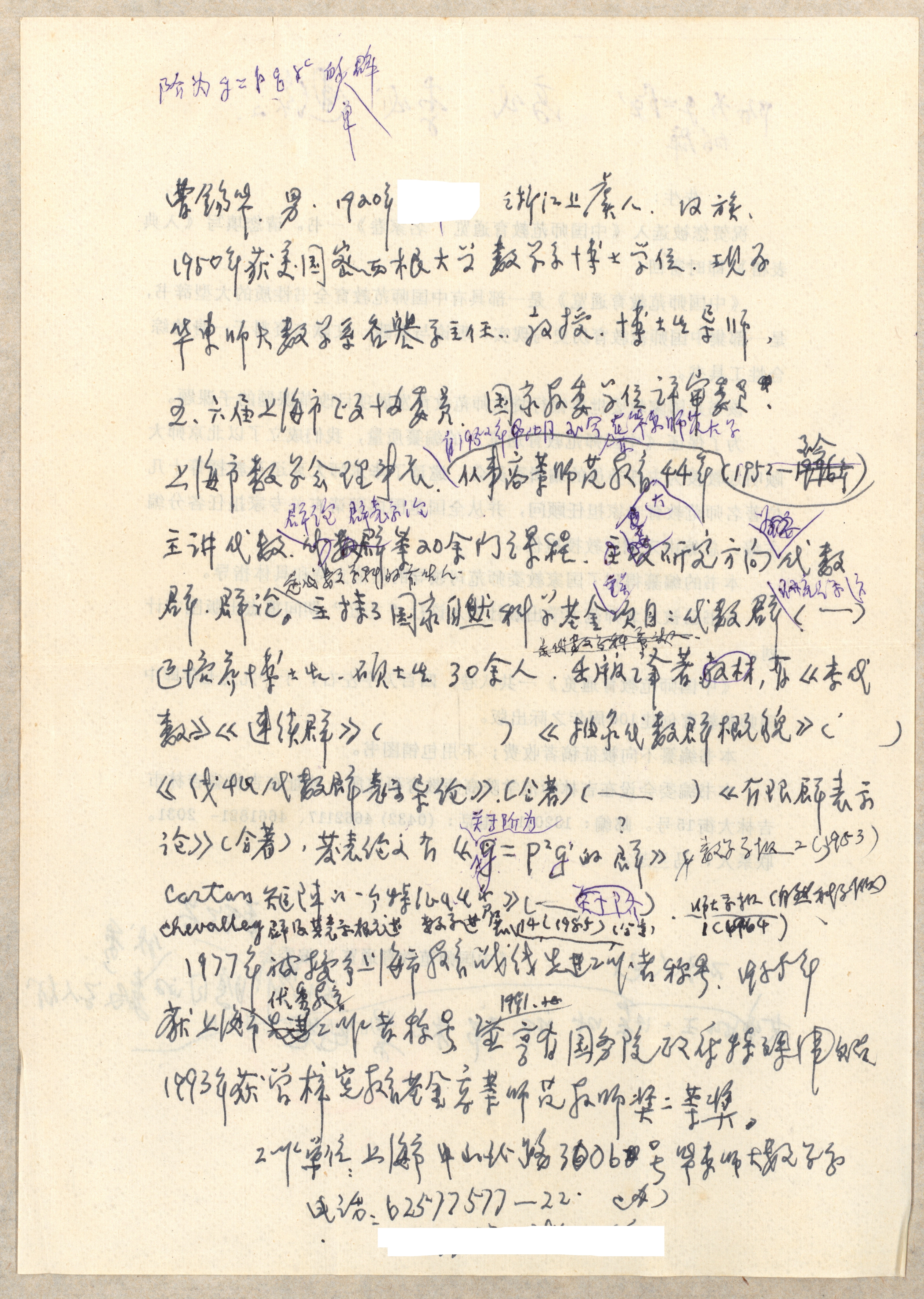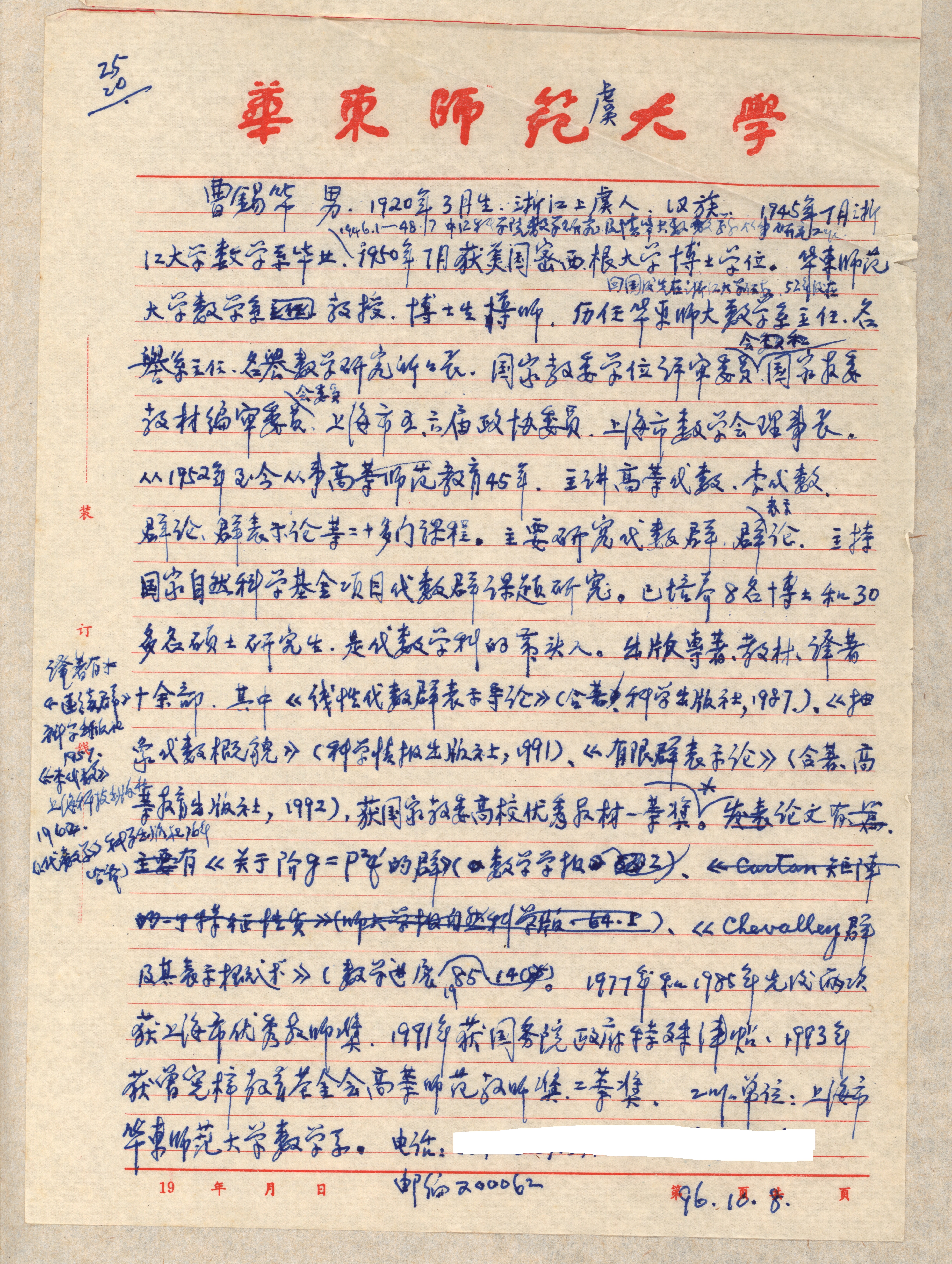 1996年10月10日曹锡华致中国师范教育通览编委会,附曹锡华手写入典条目