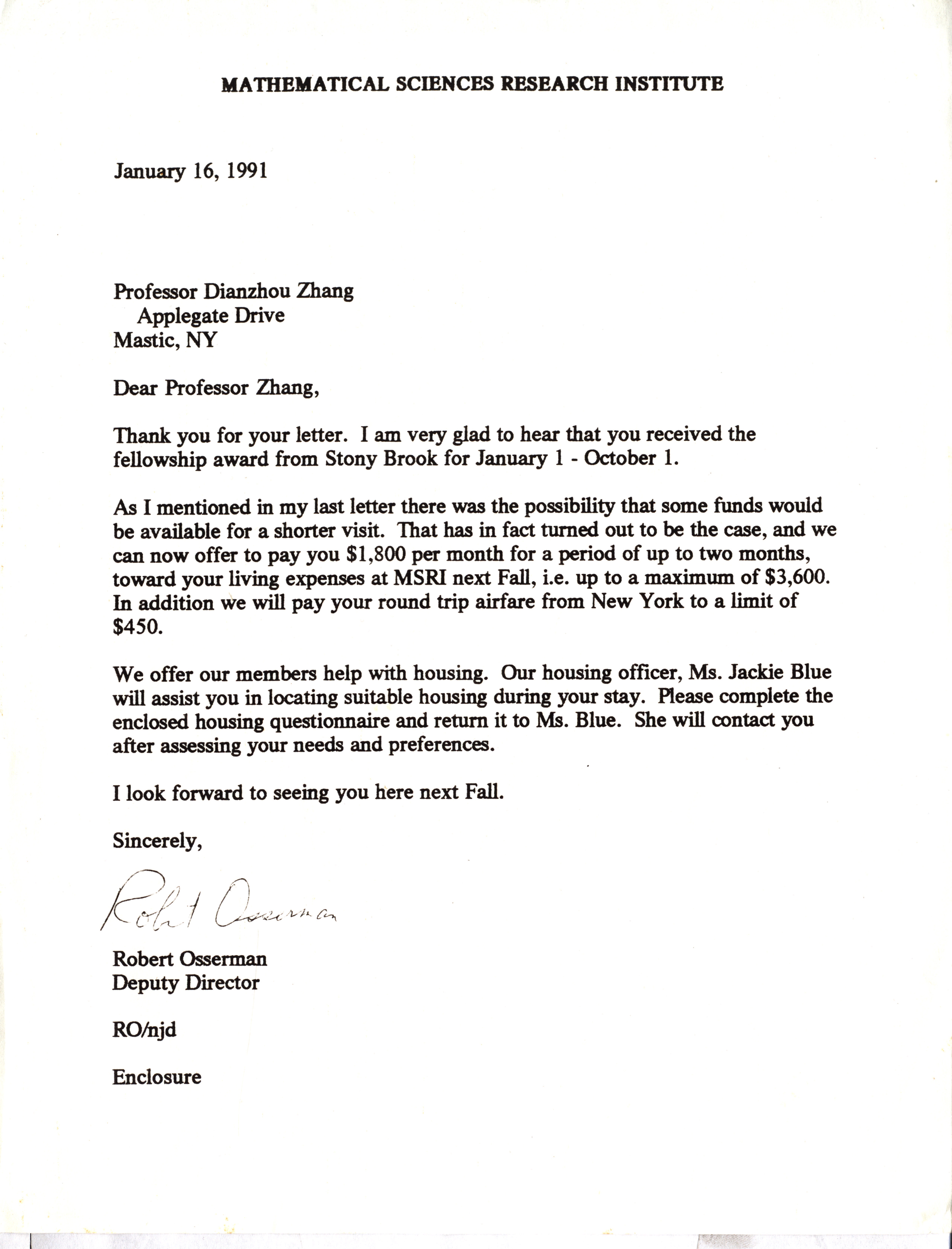 1991年1月16日Robert Osserman致张奠宙