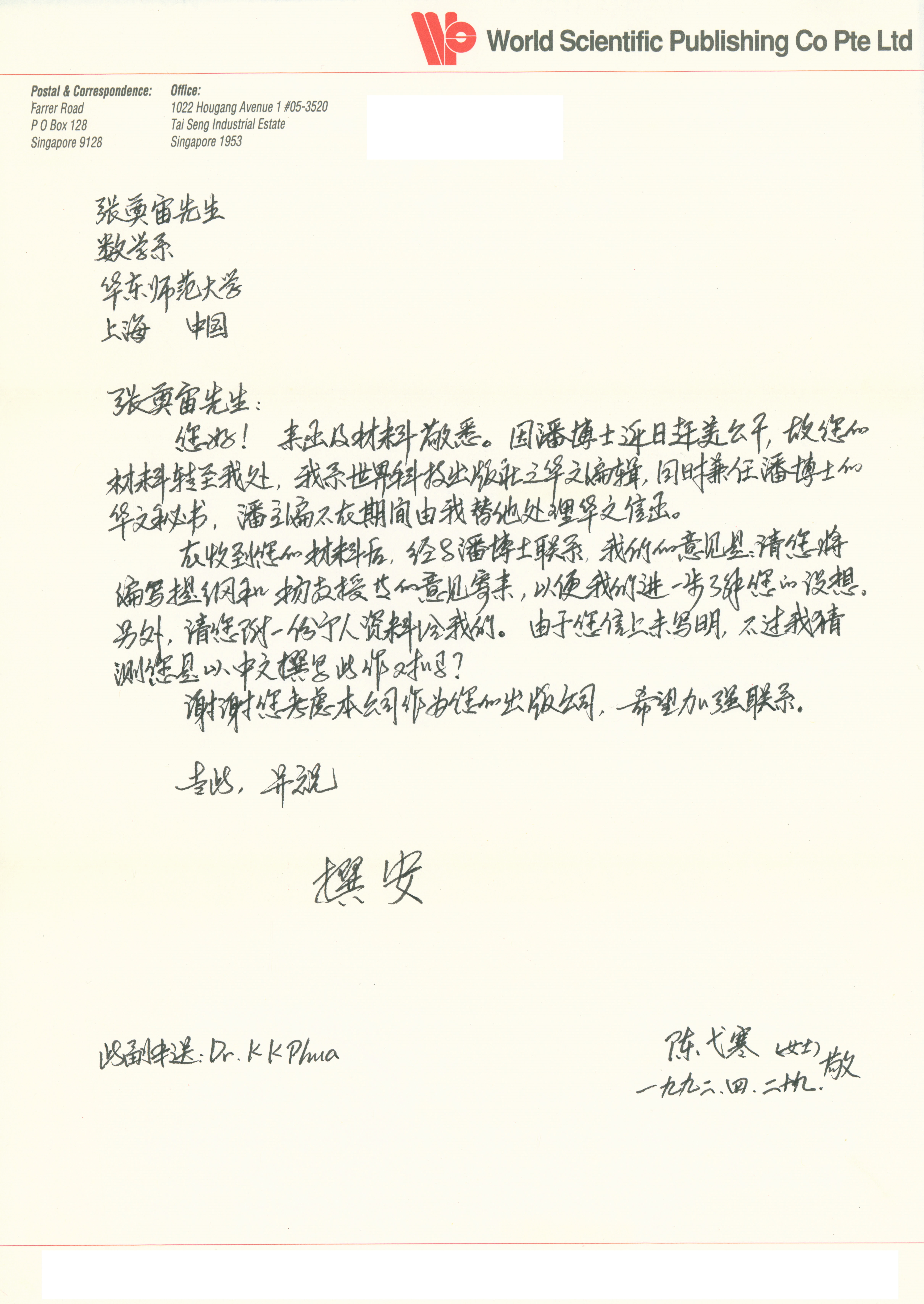 1992年4月29日陈戈寒致张奠宙