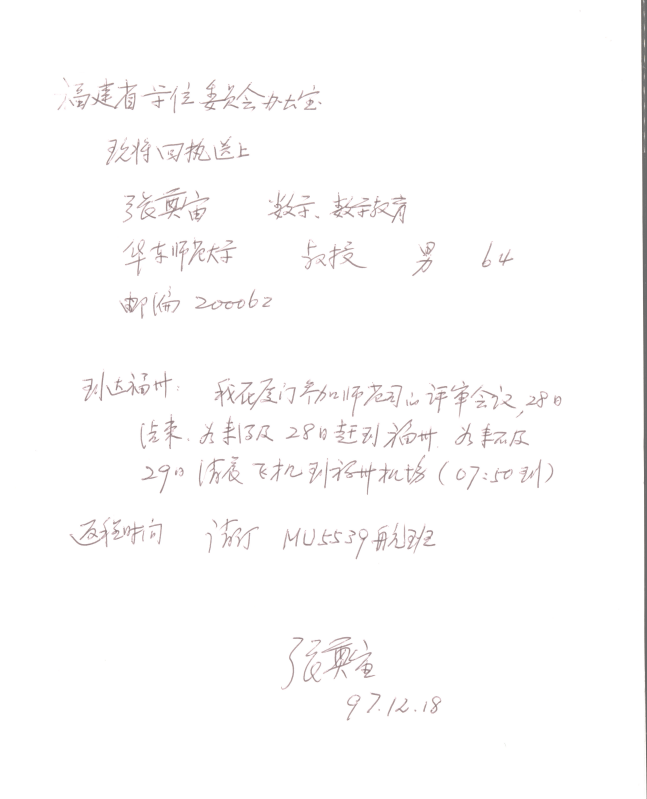 1997年12月18日张奠宙致福建省学位委员会办公室