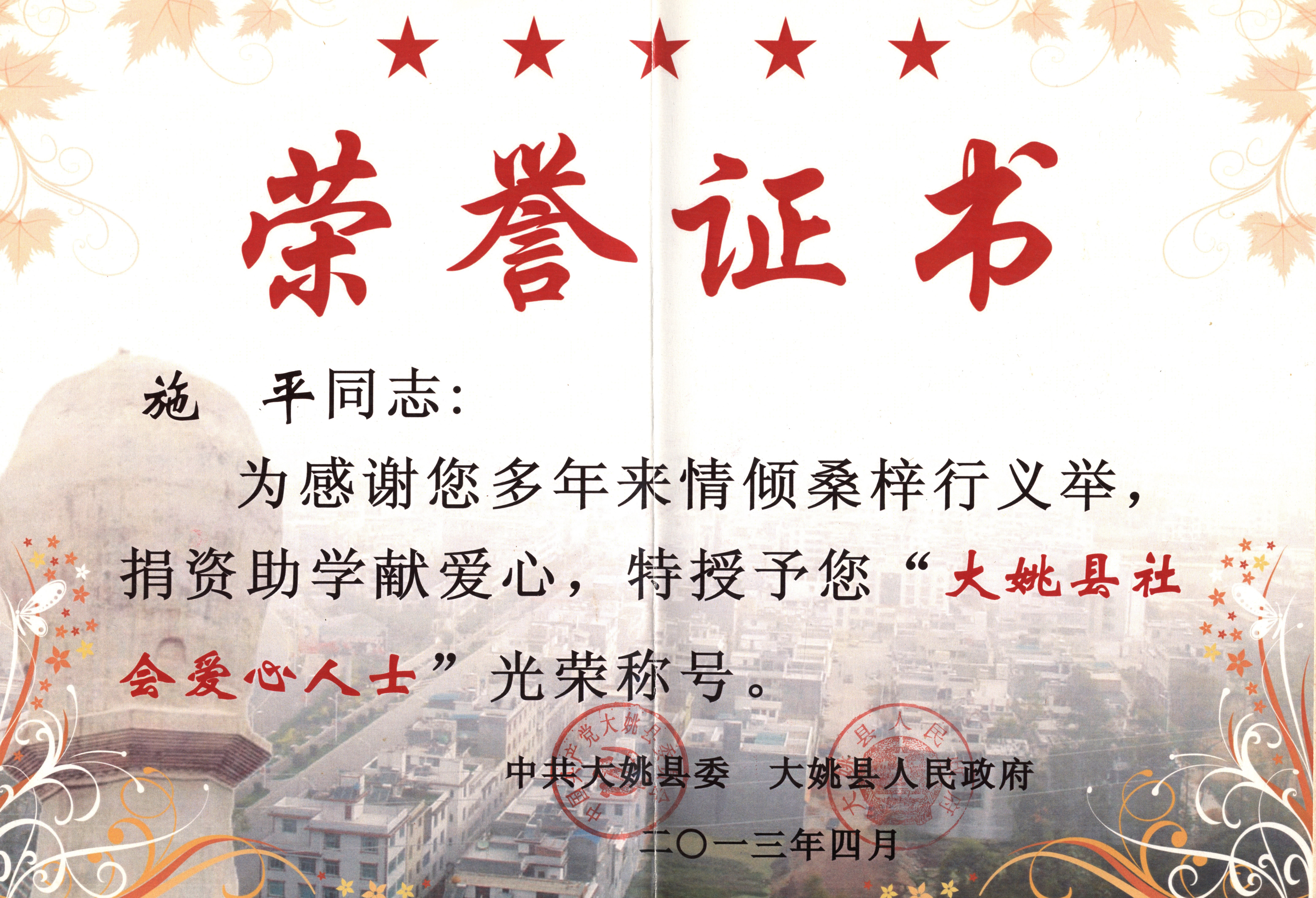 中共大姚县委大姚县人民政府授予施平同志“大姚县社会爱心人士”光荣称号