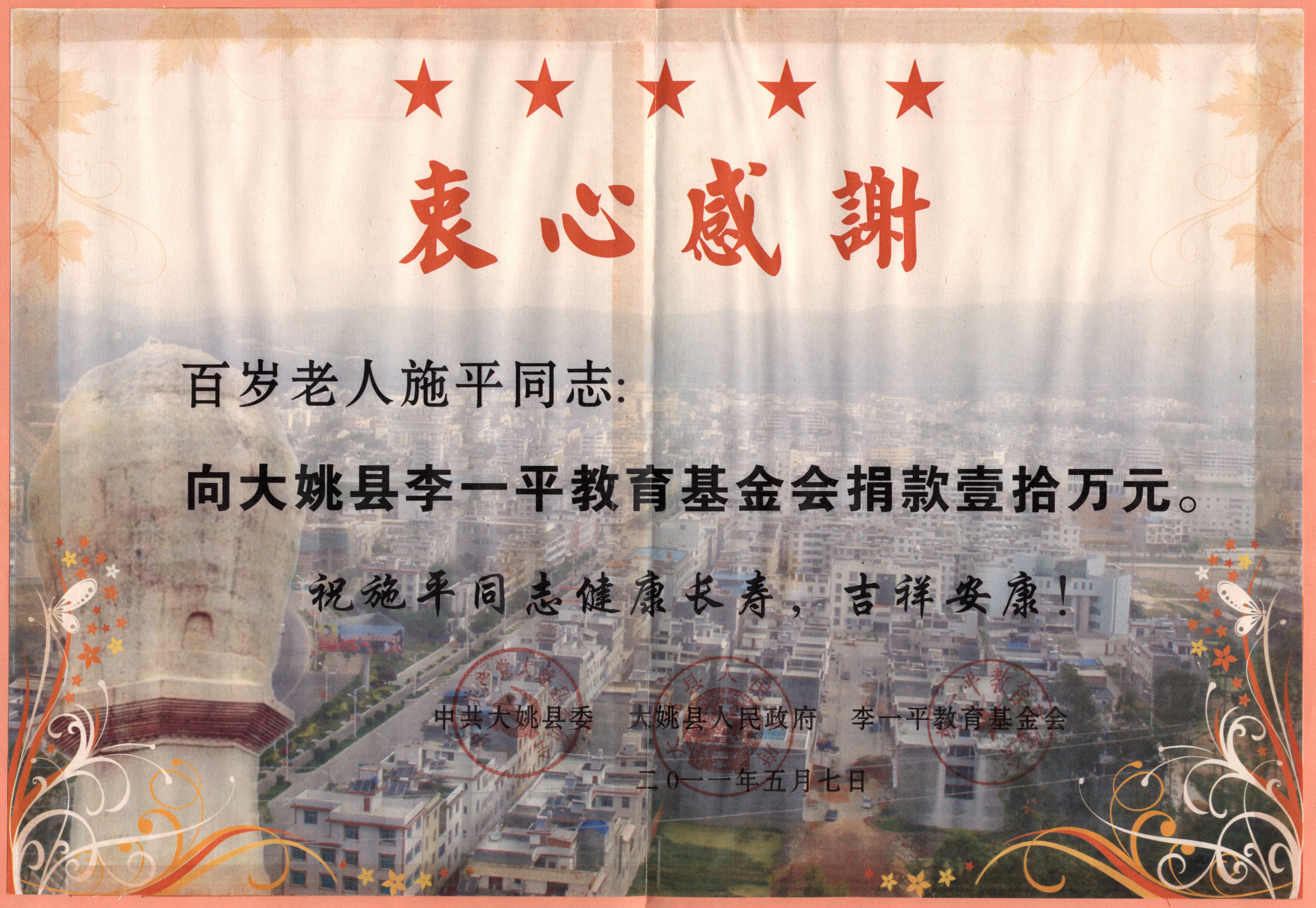 衷心感谢:百岁老人施平同志:向大姚县李一平教育基金会捐款壹拾万元