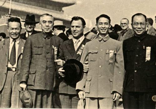 1954年施平(右2)与孙晓村(右4)、沈其益(右1)、蔡旭(右5)及苏联专家(右3)等摄于天安门国庆节观礼台