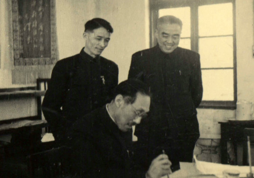 1954年3月11日北京农业大学与华北农业科学研究所(今中国农业科学院)就开展全面合作研究签订协议书。左一站立者为施平,右一站立者为孙晓村校长