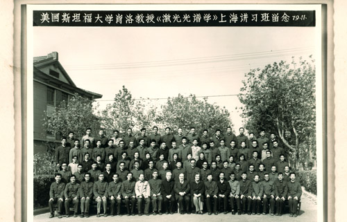 1979年11月美国斯坦福大学肖洛教授《激光光谱学》上海讲习班留念,前排左8邬学文、左9郑一善、左10肖洛、左12袁运开(郑一善家属提供)