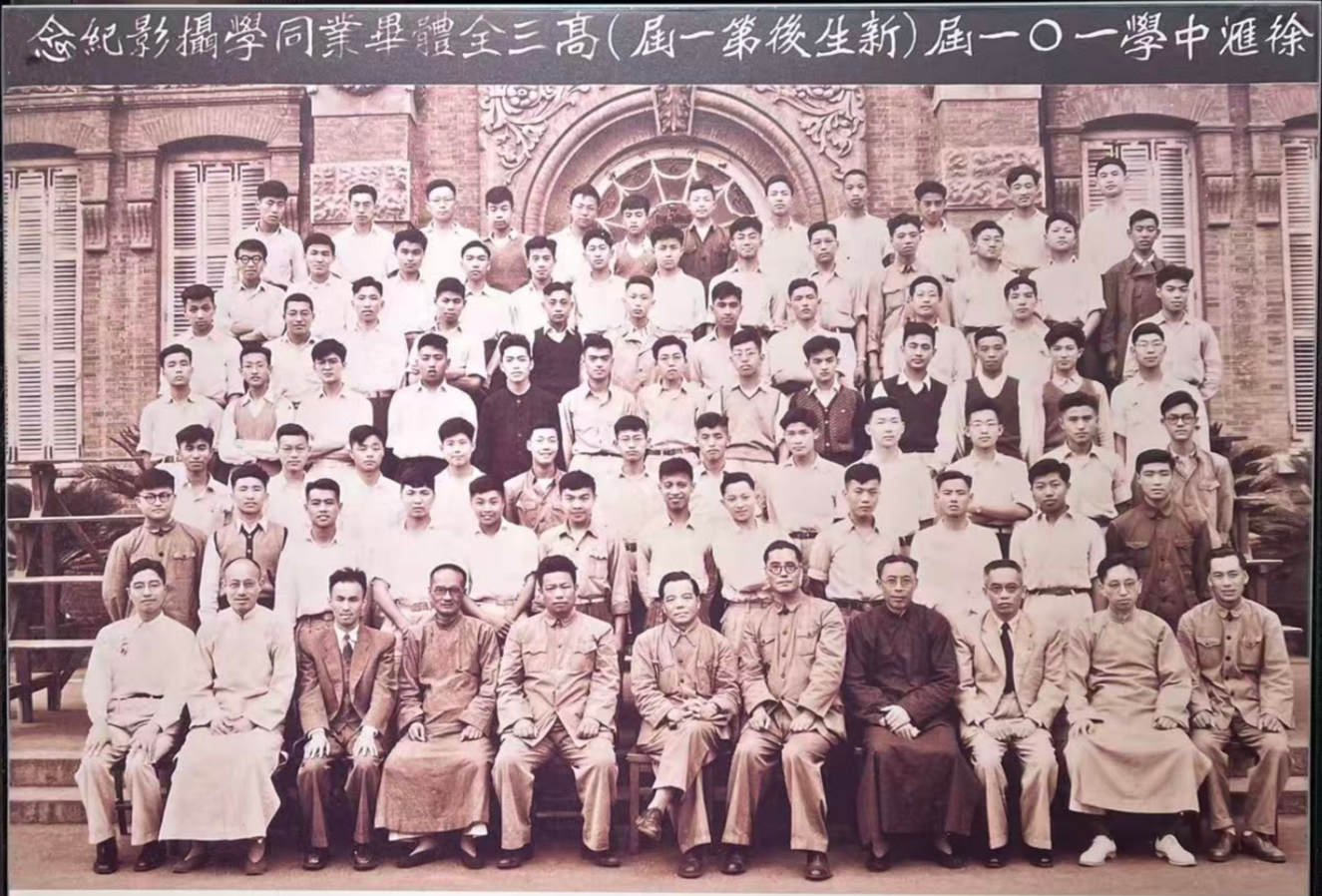 1951年徐汇中学一〇一届(新生后第一届)高三全体毕业同学摄影纪念,前排右3许国保,四排右7许国保子许政范(来源:徐汇中学)