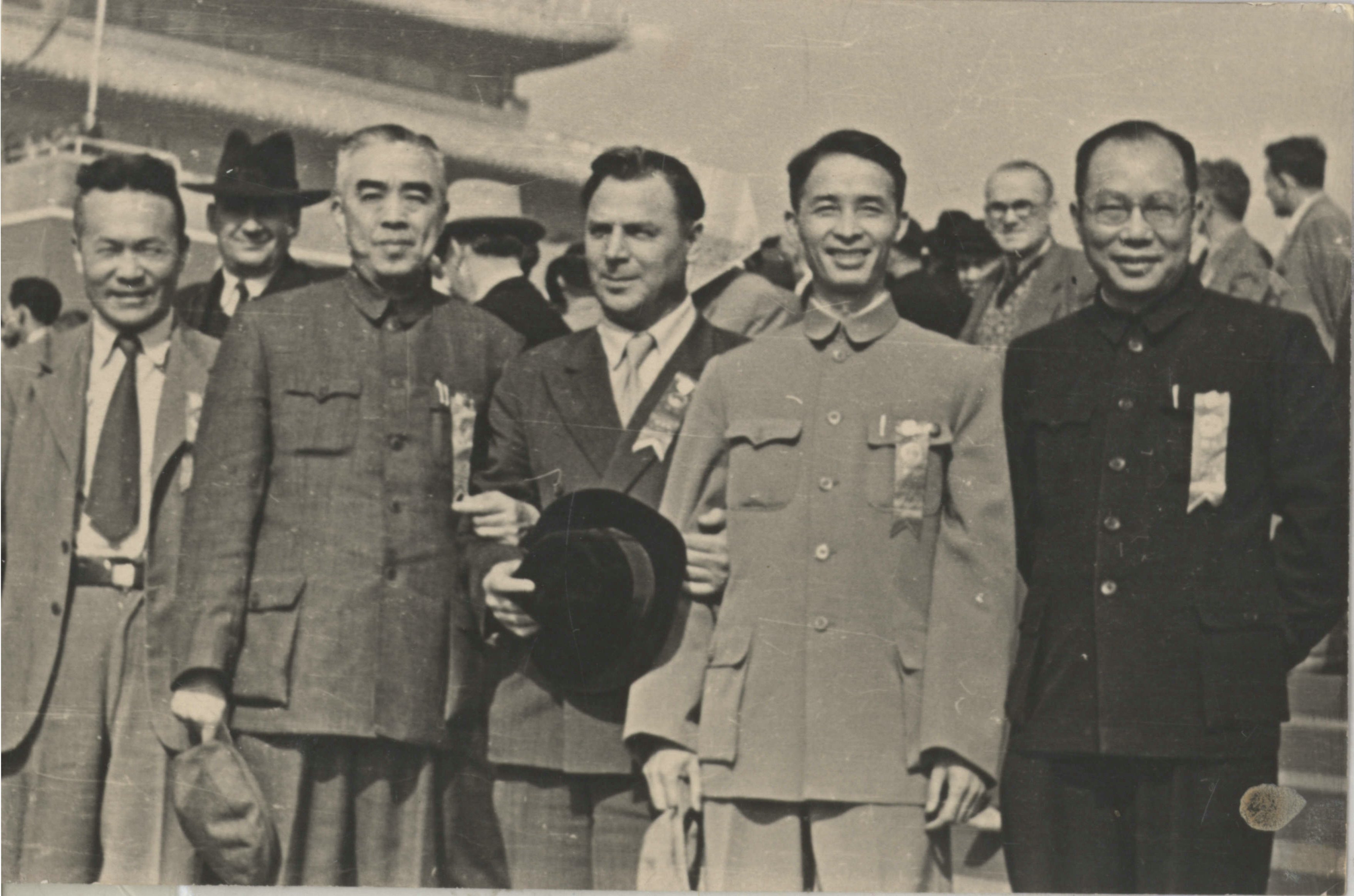 • 1954年施平(右2)与孙晓村(右4)、沈其益(右1)、蔡旭(右5)及苏联专家(右3)等摄于天安门国庆节观礼台
