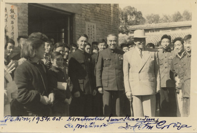 1954年10月孙晓村(右五)和施平(右六)热情会见来校参观的罗马尼亚大国民议会主席格罗查