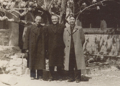 1950年代施平、孙晓村、马适安(副校长)在北京农业大学罗道庄校园内合影(从右至左)