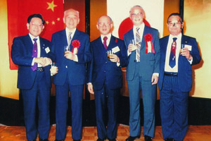 1990年10月9日北京农业大学85周年校庆庆典大会期间,石元春校长(左一)、周鹏程书记(右一)与施平老校长(右二)畅谈