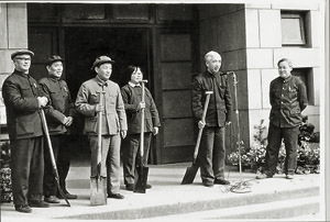 1983年3月施平(左一)陪同来华东师大视察工作的教育部领导参加植树节活动。右二为何东昌同志,右三为彭佩云同志